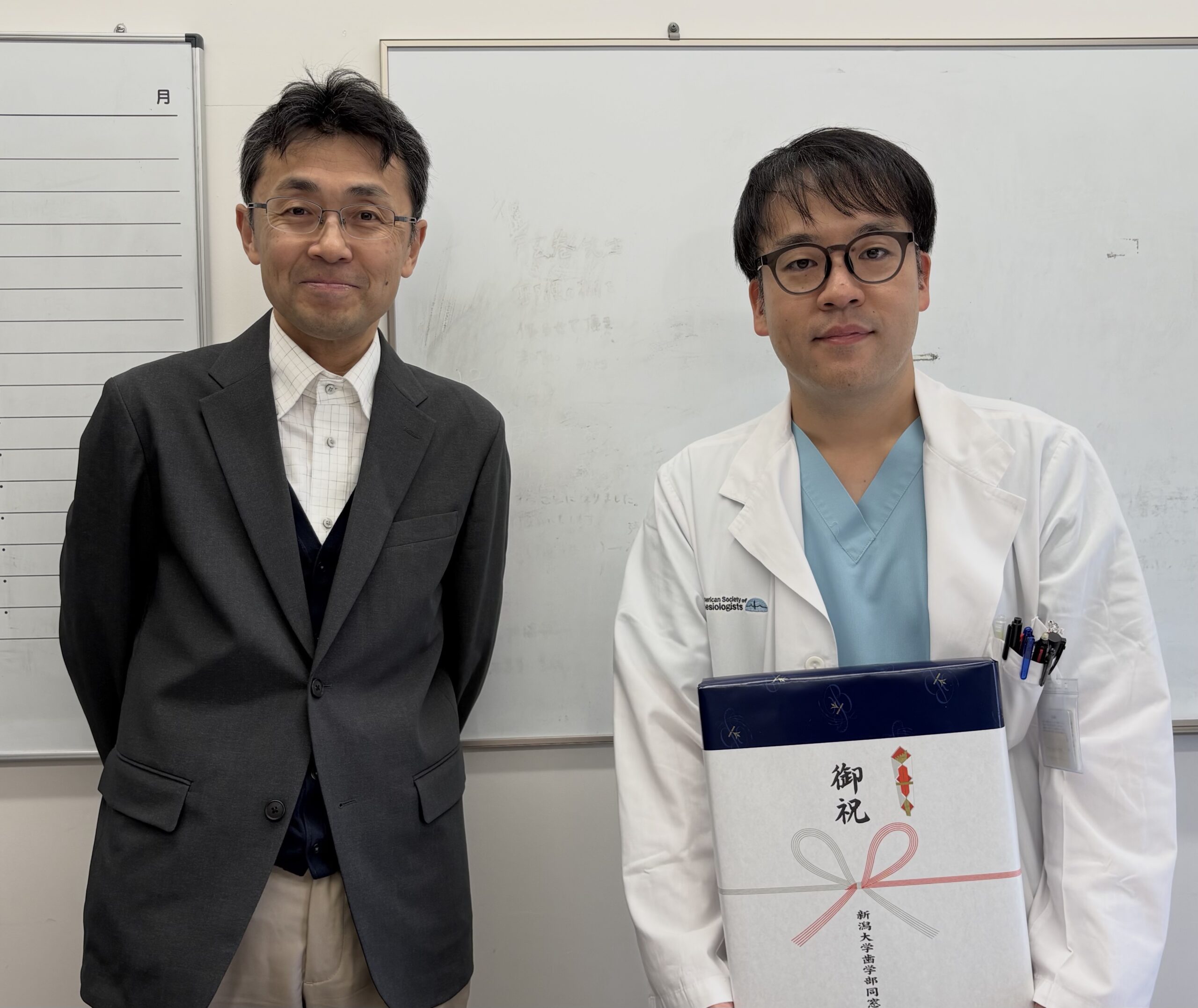 2025年12月1日付で歯科麻酔学分野教授にご就任された岸本 直隆 先生にお祝いをお渡ししました。